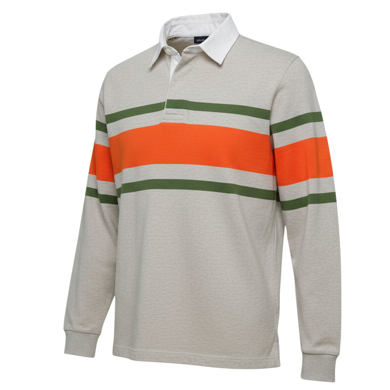 A nod to long days by the lake and nights around the fire, this rugby brings a sense of camp-season ease. The cream base feels like sun-bleached canvas, while deep green and burnt orange stripes cut through like pine and flame. Rugged, timeless, and quietly bold—built for those who know the best places are the ones found off the map.